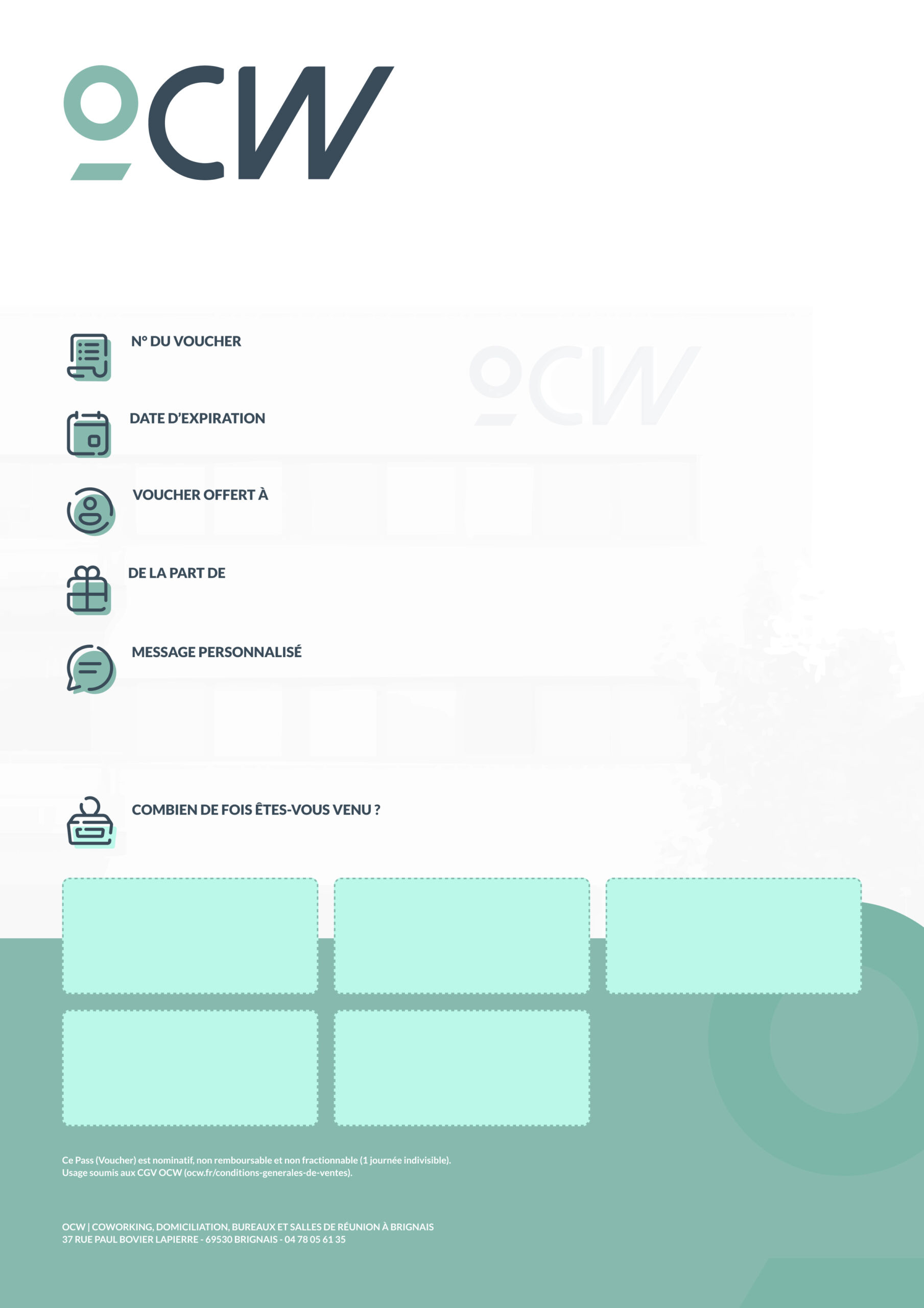 Avec le Pass Bureau Coworking OCW, installez-vous librement sur l’un de nos 20 postes en open space, à la journée ou via un forfait fractionnable de 1, 5 ou 10 jours, valable 12 mois.
